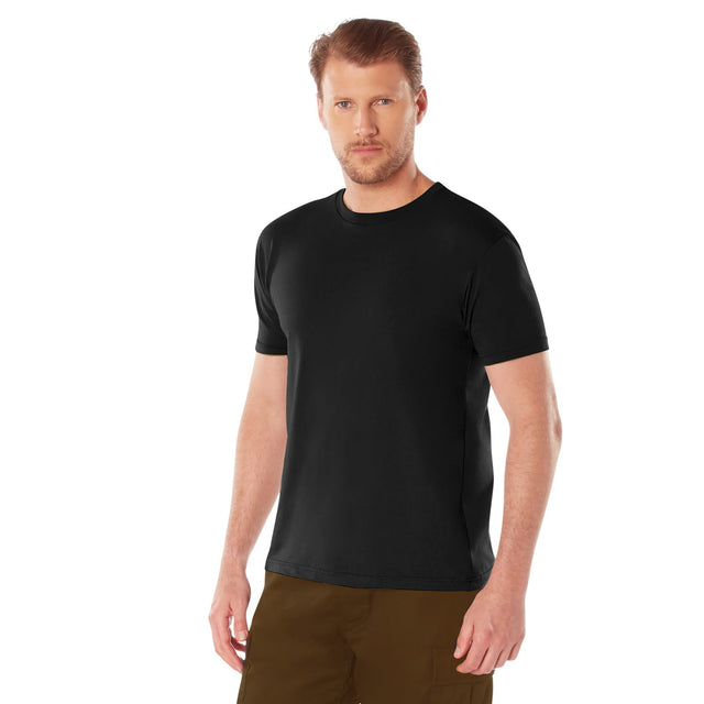 This men's black t-shirt features an athletic fit that's cut closely to the body. If you prefer a looser fit, we recommend ordering a size up from what you'd normally wear. Made of a lightweight cotton/polyester blend and featuring a tagless label, this men's crew neck t-shirt is super comfortable to wear.