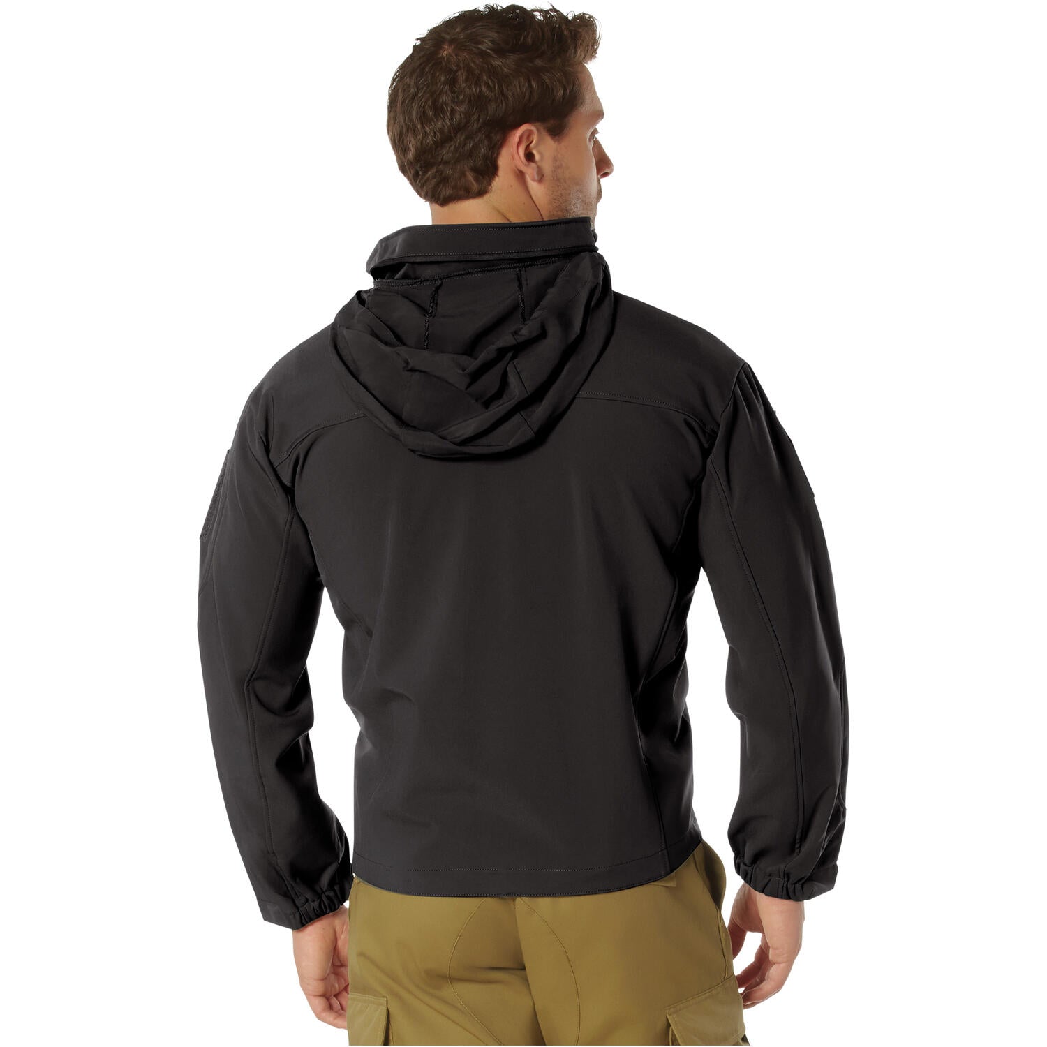 This black tactical jacket has 2 front pockets, a right forearm pocket, and a shoulder pocket on the left sleeve. All 4 pockets are zippered so everything you put in them stays safe, secure, and dry! For a perfect fit that keeps the wind out, the waist and hood have adjustable pull strings and the elastic cuffs have velcro style hook and loop adjustments. All these handy features make this a great jacket for work or play. Buy this Covert Ops black soft shell tactical jacket online today!