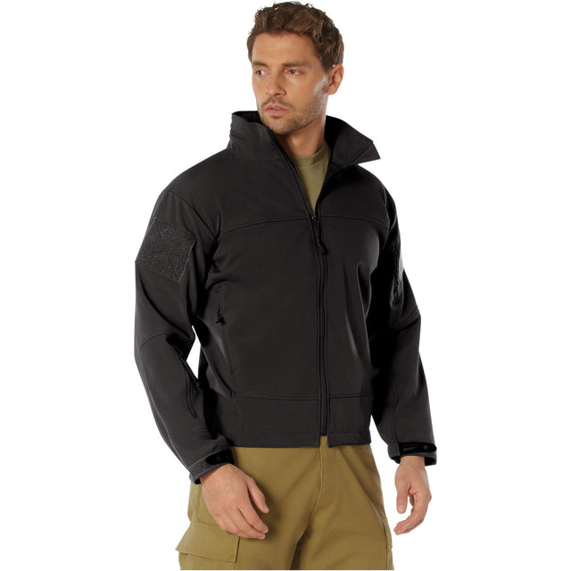 Lightweight and comfortable, this black Covert Ops soft shell jacket is great for police, security, or even everyday wear. This high quality, durable and waterproof soft shell jacket keeps you dry and comfortable without the weight! The soft outer shell of this black tactical jacket is the same material used in level 5 of the military's extreme cold weather system. The top layer of this material is a high density fabric that is 100 percent waterproof with sealed seams. The second layer wicks mositure away from the body, so you stay dry and comfortable even when you are most active. And when the weather turns rainy you can depend on the attached hood. The hood attaches to the back of the jacket with a handy velcro tab, keeping it close to the jacket and not draping outward. A three way adjustment on the hood makes sure you get a comfortable fit that doesn't obscure your vision.