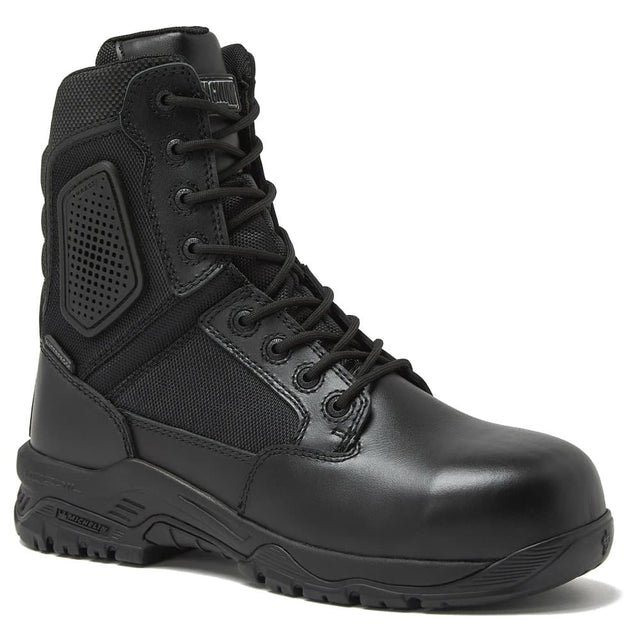 The Magnum Strike Force 8-inch Side Zip Composite Safety Toe Waterproof Tactical Boot is designed for men who need reliable performance in demanding situations. These black tactical boots are suitable for police officers, security personnel, EMTs, and paramedics who require durable and comfortable footwear. The boots feature a polishable toe, ensuring they maintain a professional appearance, while the composite safety toe provides essential protection against impact and compression.