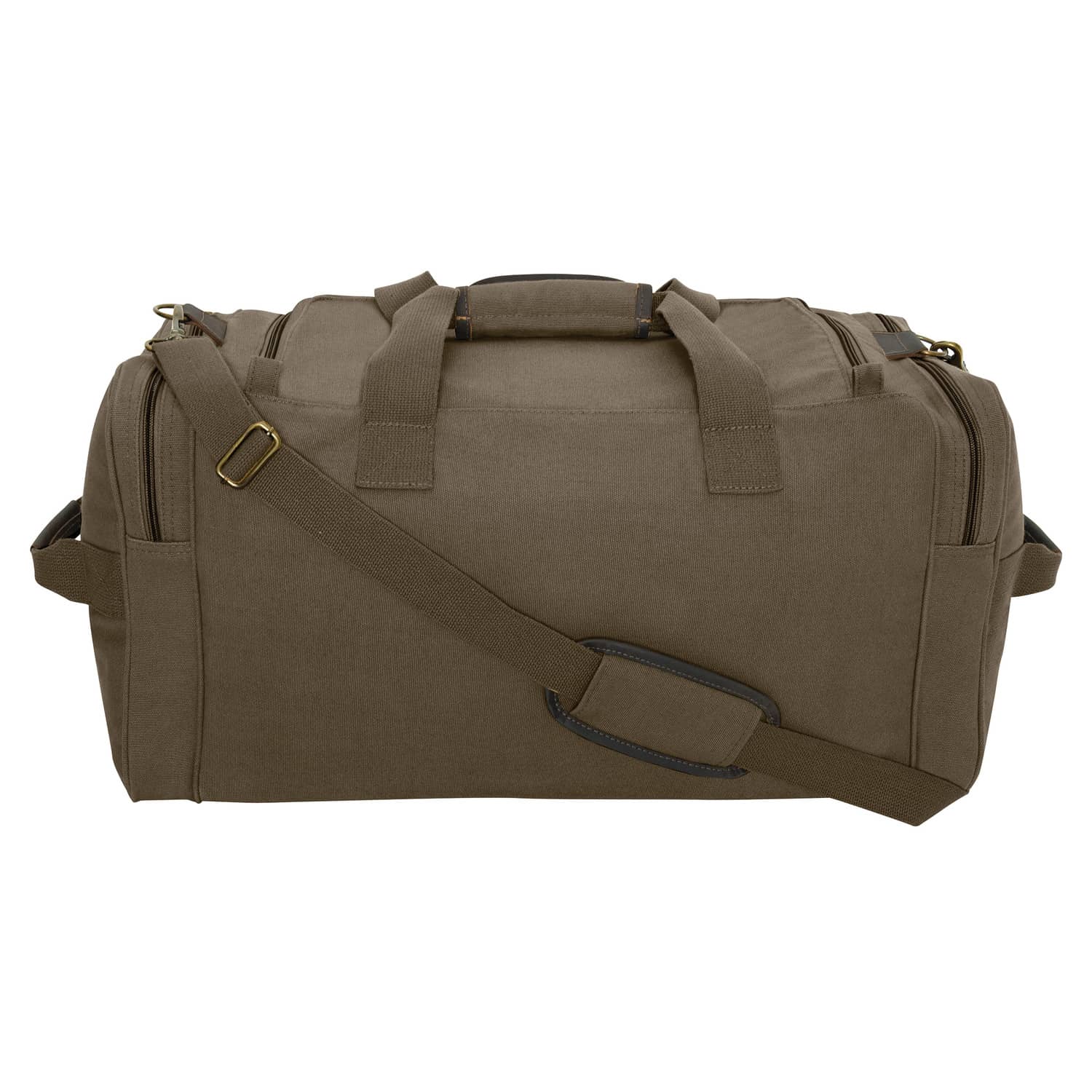 Featuring designer looks without the hefty designer price tag, the Olive Drab Canvas Long Weekend Duffle Bag allows you to travel in style on overnight or weekend trips. Made of durable heavyweight canvas with leather accents and antique brass hardware, this duffle bag sports good looks that you won't believe for the value. And measuring in at a roomy 23 by 12 by 11 inches with two zippered side pockets perfect for toiletries or personal electronics, this is an awesome duffle bag for extended weekend excursions. On top of that, this duffle bag features two ways to carry it via either the two carry handles or adjustable shoulder strap.