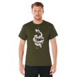 Embrace a spirit of resilience with the Olive Drab Come and Take It Graphic T-Shirt. This shirt features the bold "Come & Take It" slogan, a symbol of determination deeply rooted in history. The design includes a detailed graphic of a snake and rifle, making it a strong statement piece. Made with a high-quality cotton and polyester blend, this shirt offers durability and comfort, suitable for daily wear. The breathable fabric ensures comfort throughout the day, complemented by a tag-less label that eliminates irritation.