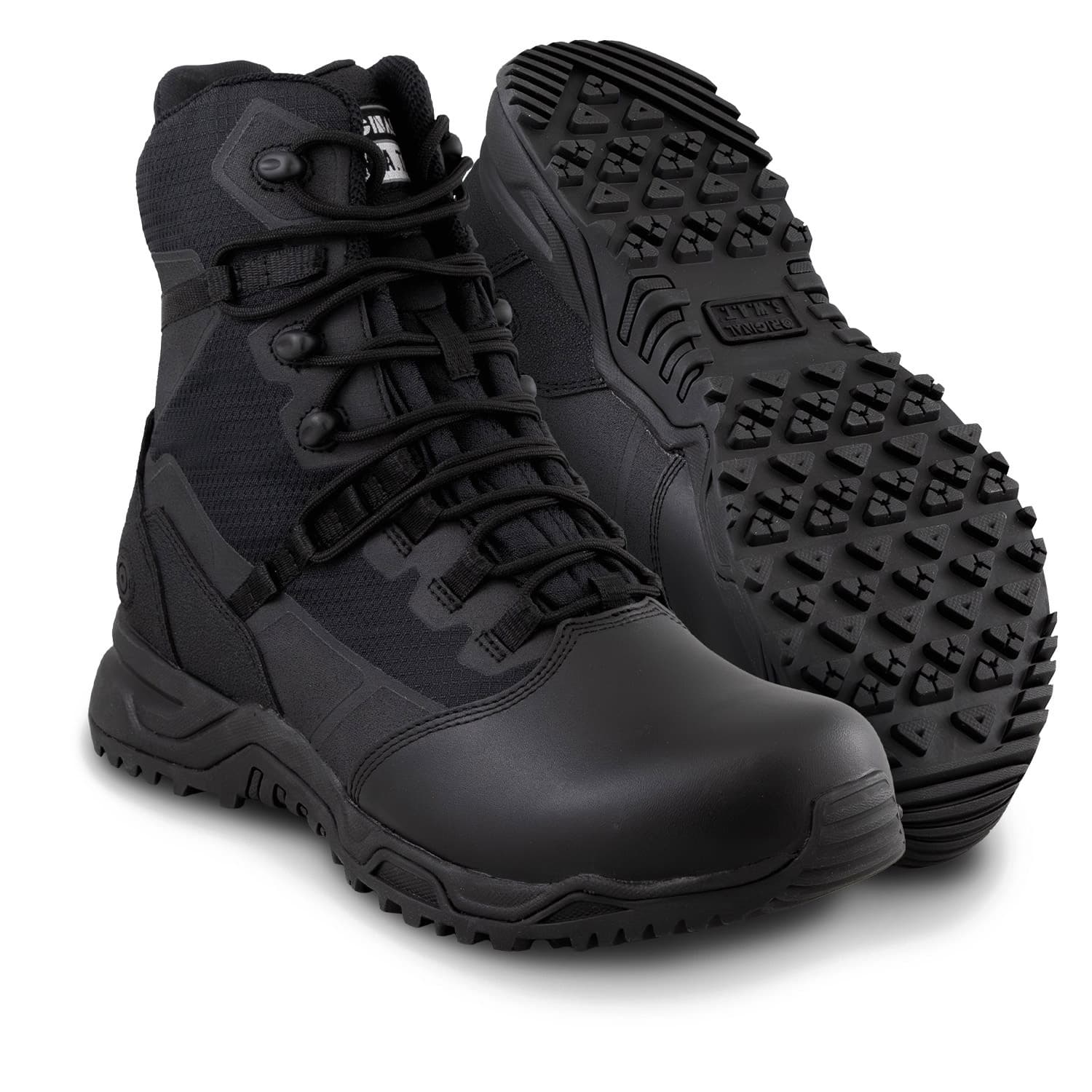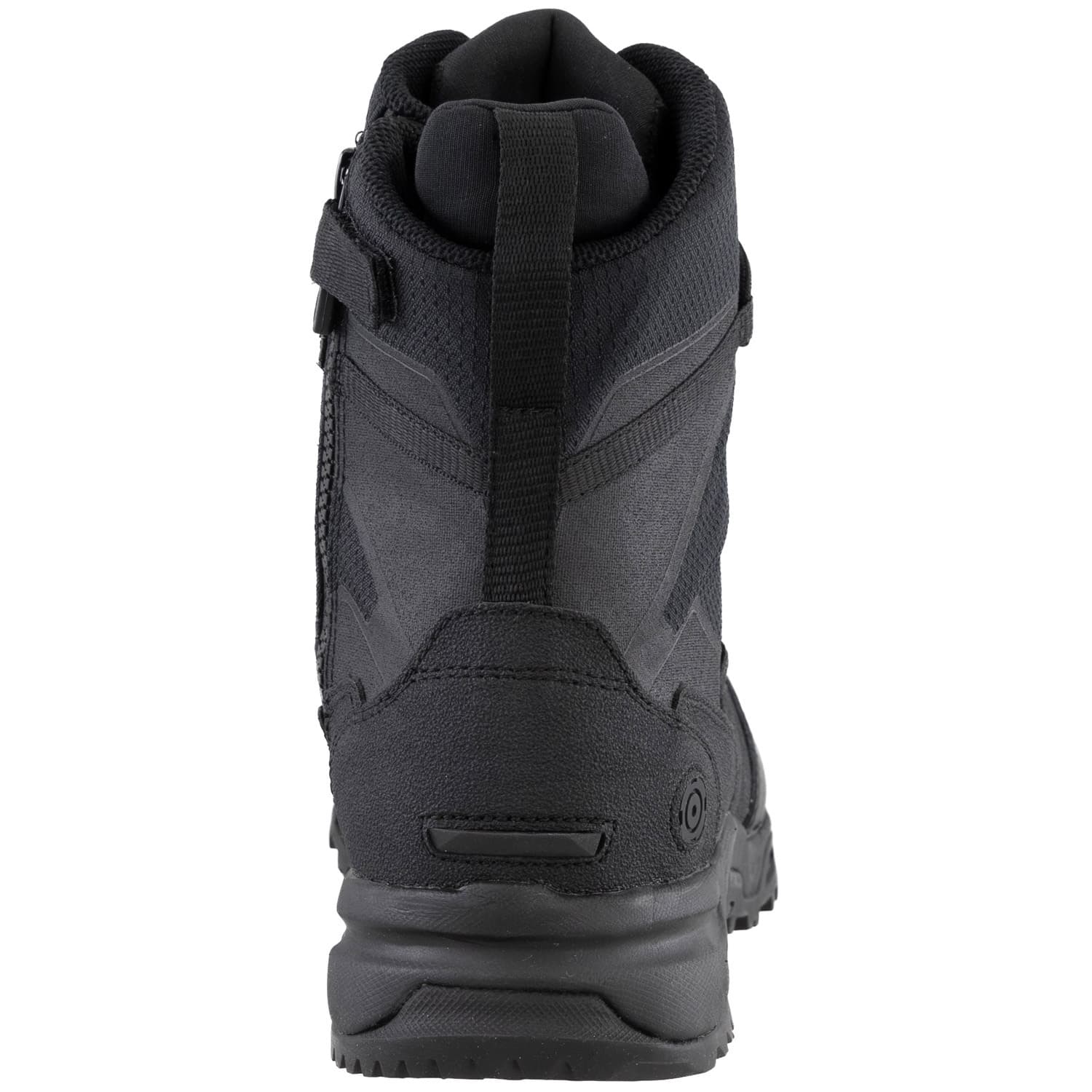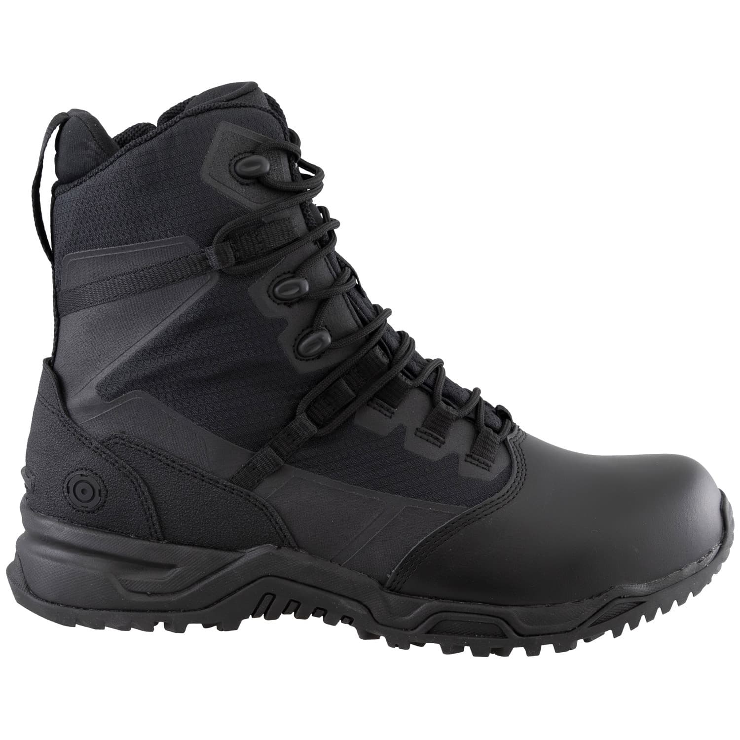 The Original S.W.A.T. Alpha Fury 8-inch Polishable Toe Side-Zip Men's Black Tactical Boot, model 186401, is designed for men who require a blend of comfort, agility, and durability. These tactical boots are constructed to be lightweight, making them suitable for extended wear without sacrificing performance. Their black color and polishable leather toe contribute to a professional appearance, ideal for uniformed service.