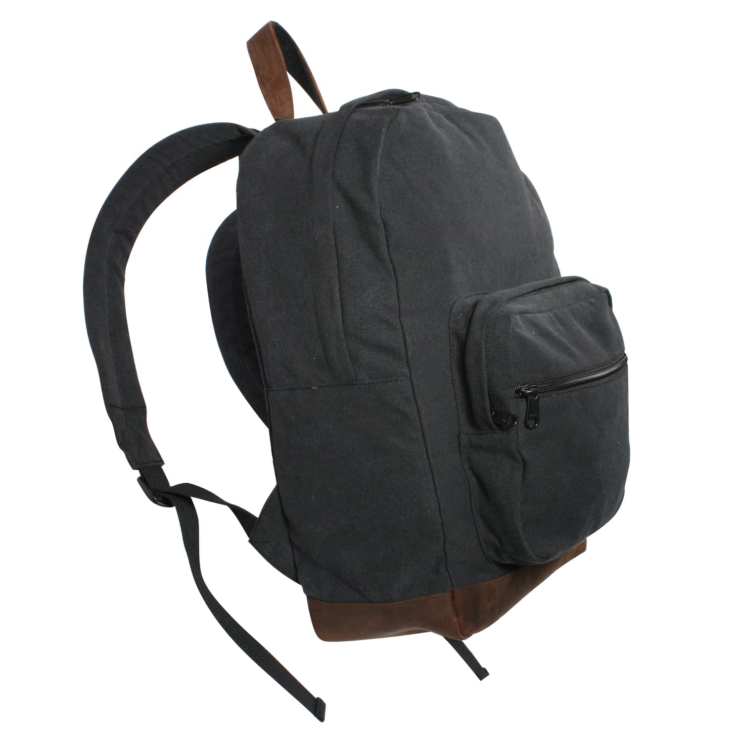 Whether you're carrying your gear on a hiking trip or books in school the Black Vintage Teardrop Canvas Backpack is perfect for you. This durable black canvas pack gives you a bag with classic military bookbag design you'll love and plenty of space you need. This black backpack features padded shoulder straps so you stay comfortable while on the move and a leather bottom that protects everything inside when you need to put the pack down. A large main compartment in this pack has an interior cell phone pocket and a cushioned section designed to keep your laptop safe while inside. Extra storage pouches on the front and top make sure you have everything you need close at hand, making this an ideal military style school bag. Get your Vintage Black Teardrop backpack today!