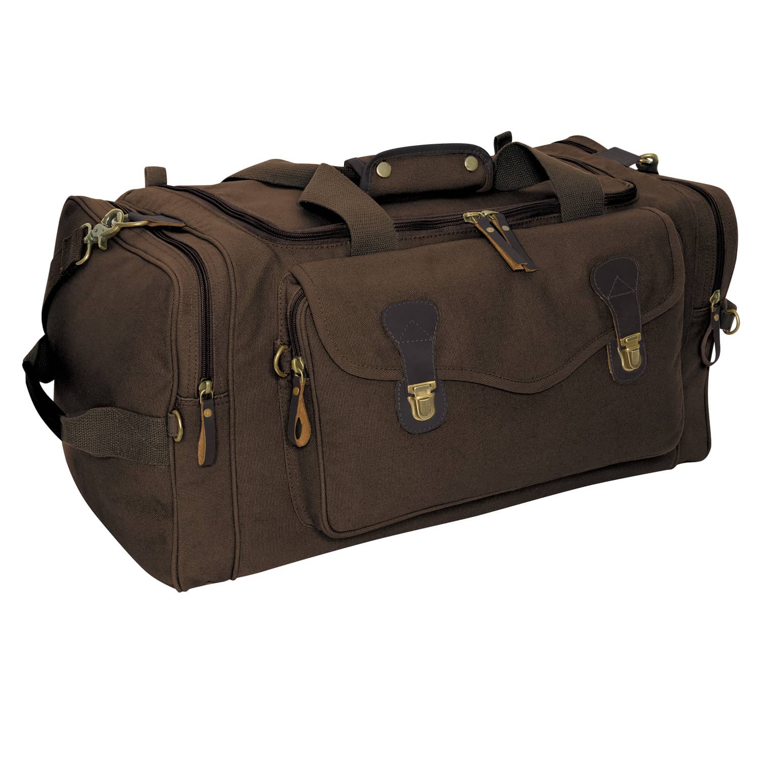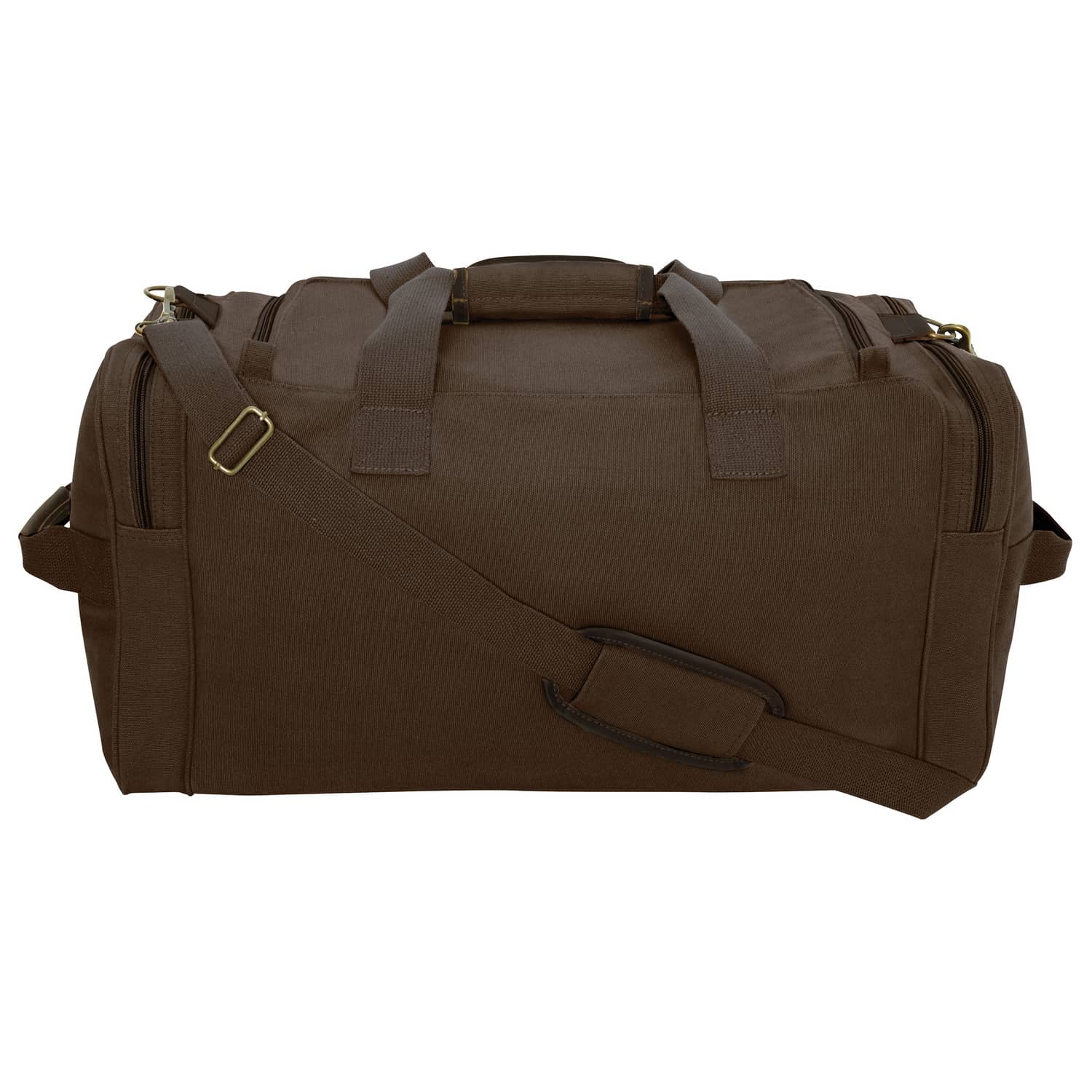 This brown canvas duffel bag is perfect for overnight or weekend trips. Made from a durable cotton canvas, this travel bag is rugged enough for any trip. This duffel bag features a large main compartment and 3 outer pockets so you can carry everything you need on your next vacation. For a cool vintage look, the long weekend travel bag as leather zipper pulls and antique brass hardware. An adjustable shoulder strap and 3 carry handles make it easy to take this duffel bag everywhere you need to be. Order this vintage duffel bag online today!