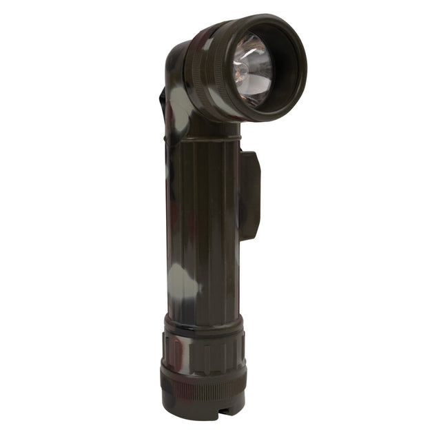 Built tough and modeled after a classic military design, this Woodland Camo D-Cell Anglehead Flashlight is great for camping trips and emergency preparedness. Made with a durable, plastic body with a unique 90-degree angle design, this light is ready for any challenge and easy to aim. A sturdy metal clip combined with the angle head shape makes it possible to aim light where you need it while keeping your hands free when the light is attached to a belt, pocket, or strap. The woodland camo pattern on this GI-style light will help you blend in to your surroundings and wonít stand out amongst the rest of your camouflage gear. This military flashlight runs on 2 D-cell batteries (not included) and comes with a spare bulb and interchangeable, multicolored lenses that make it extremely versatile for use in different low-light conditions. Don't get left in the dark, order this military flashlight online now!